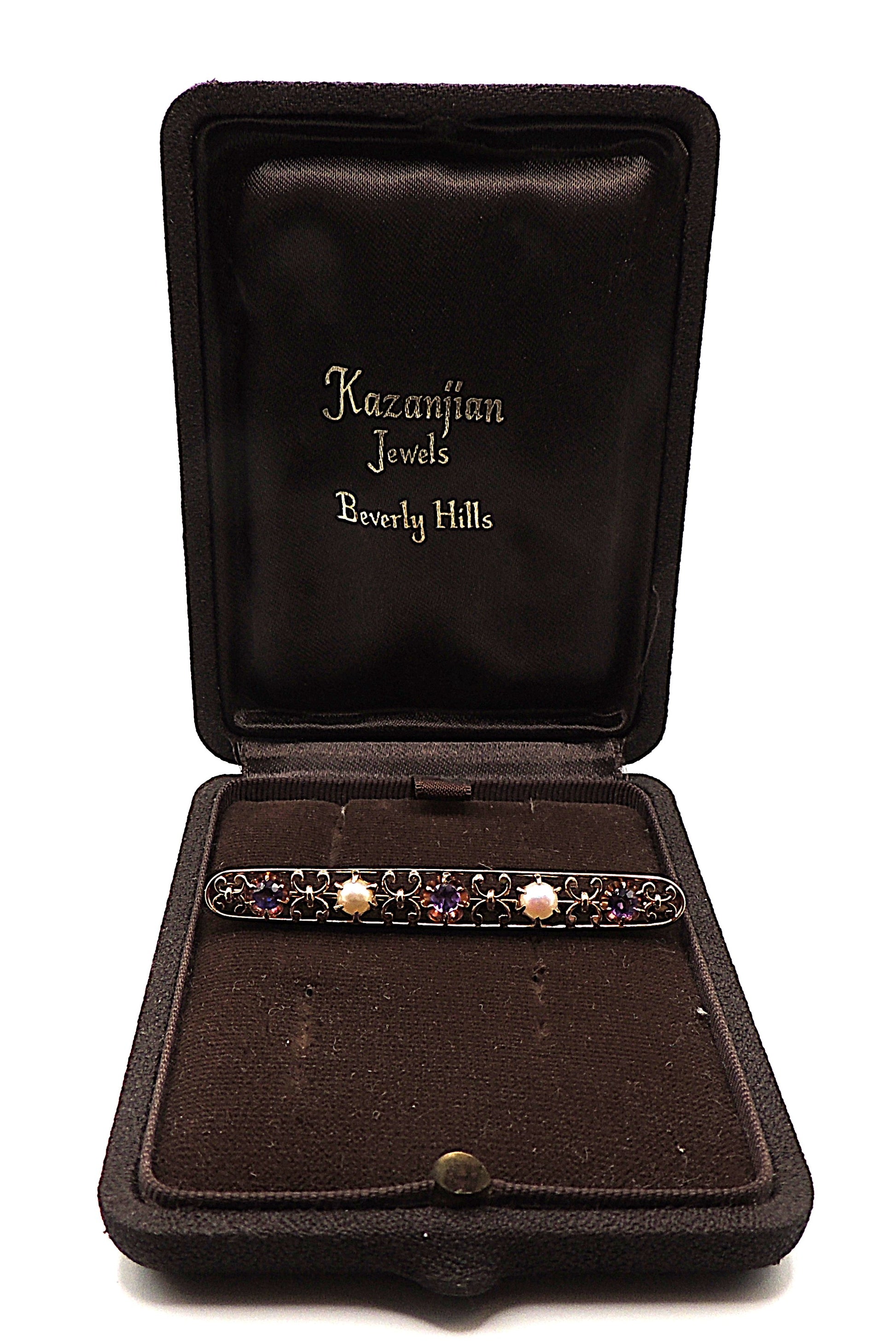 This elegant antique bar brooch dates to the Edwardian era, circa 1905–1915, and features a refined alternating design of rich purple amethysts and luminous pearls set in 18kt yellow gold. The brooch is finely hand-fabricated with openwork scrolling motifs typical of the period, creating a light, graceful appearance while retaining excellent structural integrity. Each gemstone is individually set, reflecting the craftsmanship of early 20th-century jewelers. An original early safety clasp—a transitional form between the Victorian C-clasp and later rollover mechanisms—confirms both the age and quality of this piece. The clasp functions securely and remains in excellent condition. The brooch is presented in a fitted Kazanjian Jewels, Beverly Hills box, a distinguished luxury jewelry house known for fine estate and gemstone jewelry. While the box may be later than the brooch itself, it adds historical interest and enhances presentation.